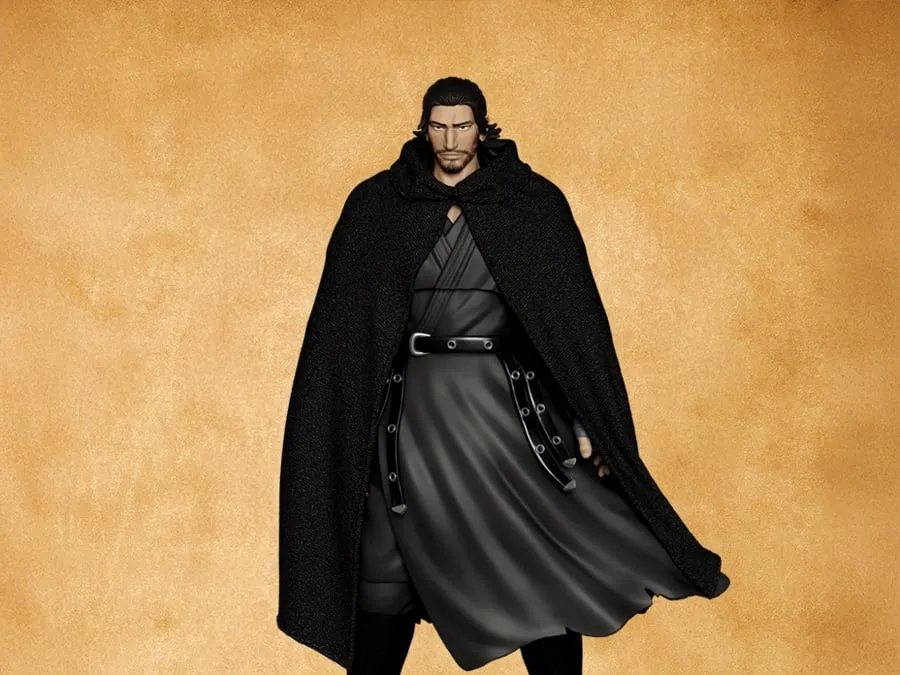 La textura del traje también destaca. No es un negro plano: tiene matices, sombras y pliegues bien definidos, simulando tela pesada. Incluso los cinturones y hebillas tienen relieve fino. El sombrero tradicional tipo kasa (de viajero) aporta muchísimo carácter y permite recrear poses icónicas del personaje caminando bajo el sol o preparándose para una pelea.