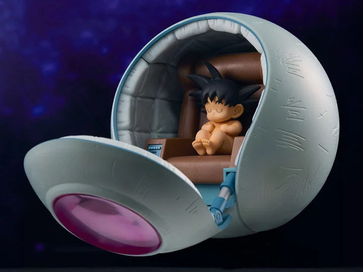 Kakarot, conocido en la Tierra como Goku, es enviado en una cápsula espacial desde su planeta natal, Vegeta, con la misión inicial de conquistar la Tierra. Sin embargo, un golpe en la cabeza al llegar lo hace olvidar su misión original y lo lleva a convertirse en un protector del planeta. Esta figura captura a Kakarot en su forma más inocente, mientras duerme en la cápsula espacial, simbolizando el comienzo de su viaje que lo llevará a convertirse en el mayor defensor de la Tierra y en un símbolo de esperanza y valentía.