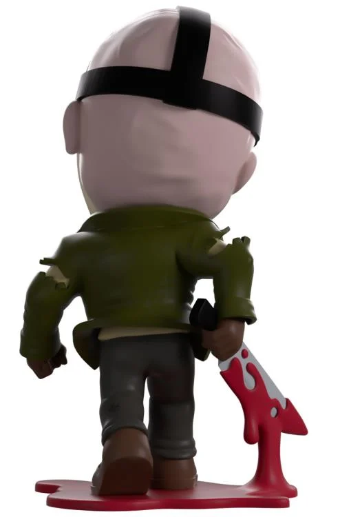 En su mano derecha sostiene un cuchillo ensangrentado, cuya hoja tiene un acabado brillante y un efecto de sangre estilizado en rojo intenso que parece chorrear hasta la base. Esta arma, inseparable de Jason, añade ese toque siniestro y brutal que equilibra perfectamente la ternura del diseño con la ferocidad del personaje. La figura se apoya sobre una base roja irregular, simulando un charco de sangre, reforzando el tono macabro pero con un guiño humorístico propio del arte de Youtooz.
