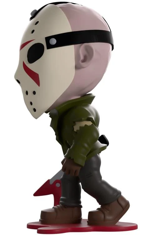 El empaque es otro punto fuerte de esta figura. Youtooz presenta cada pieza en una caja de ventana ilustrada de alta calidad, diseñada para ser tanto protectora como exhibible. En la parte frontal, el nombre Jason destaca en letras rojas sobre fondo negro, junto con el número #16, identificando su posición dentro de la línea Horror Collection de Youtooz. Los laterales muestran ilustraciones del personaje en el mismo estilo cartoon, mientras que la parte trasera incluye gráficos inspirados en la franquicia Friday the 13th, completando una presentación visualmente impecable.