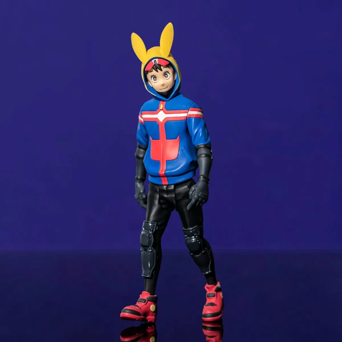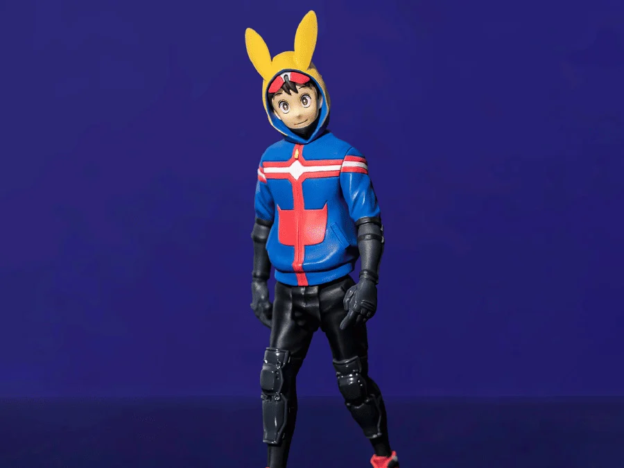 Los pantalones negros ajustados y las protecciones en las rodillas demuestran la atención al detalle del fabricante. Cada elemento está pensado para evocar el estilo de un héroe urbano que patrulla las calles, más cercano a un justiciero de barrio que a un héroe profesional. Las botas rojas con cierres frontales y detalles amarillos, además de su estructura robusta, aportan equilibrio a la figura y refuerzan el look deportivo característico de Koichi.