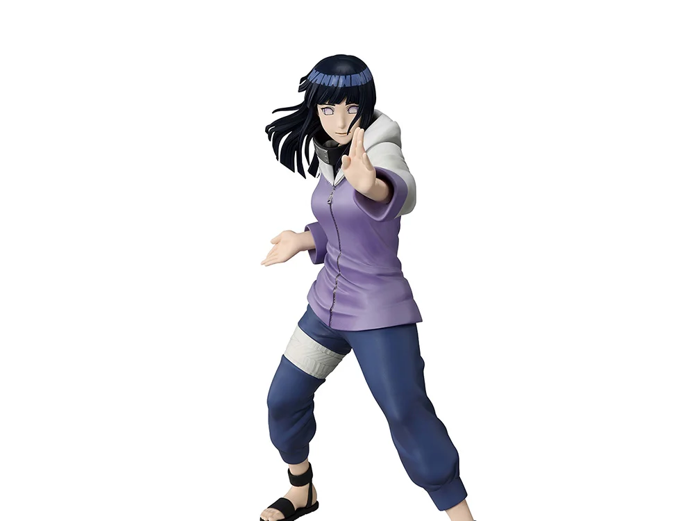La figura muestra a Hinata en una pose elegante y al mismo tiempo dinámica, con un aire sereno que refleja su naturaleza bondadosa y su espíritu inquebrantable. Su vestimenta está basada en el atuendo que lleva en los arcos finales de Naruto Shippuden, durante la Cuarta Guerra Ninja y los momentos que definen el destino del mundo shinobi. El nivel de detalle en la escultura es impresionante: desde las texturas en su chaqueta hasta los pliegues y caída natural de la ropa, cada elemento ha sido trabajado con dedicación para otorgar un realismo sobresaliente.