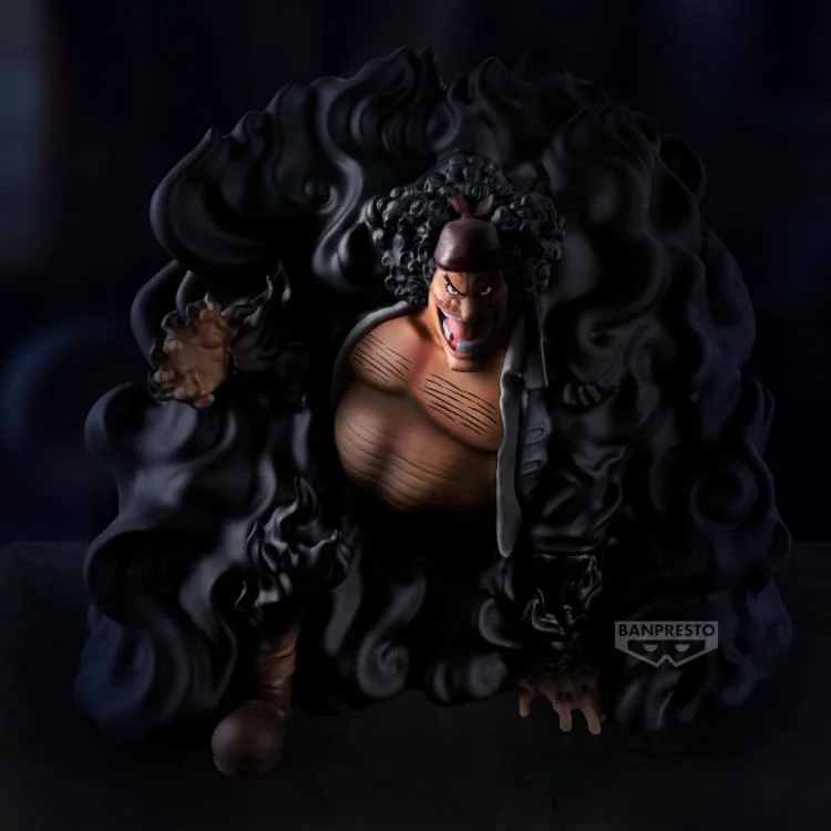 El rostro de Marshall D. Teach ha sido esculpido con una precisión excepcional. La expresión de determinación y malicia en sus facciones, junto a la mirada penetrante y desafiante, refleja el carácter implacable del capitán y su sed de poder. Cada línea y cada detalle de su semblante están diseñados para transmitir la dualidad de un hombre que, a pesar de su apariencia calmada, esconde un interior repleto de ambición y oscuridad. Su cabello, cuidadosamente modelado, y la textura de su vestimenta son testimonio del minucioso trabajo que Banpresto ha realizado para que cada rasgo se asemeje al diseño original del anime.