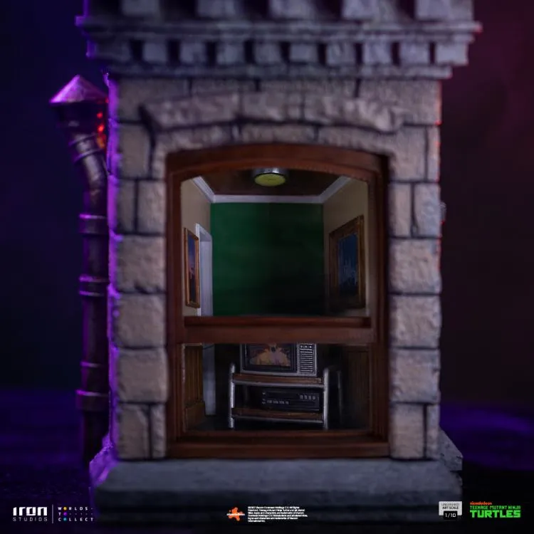 La base es otro de los grandes protagonistas de esta estatua. Representa una estructura urbana tipo azotea o edificio, con ladrillos, tuberías y elementos arquitectónicos que evocan claramente el entorno de Nueva York, hogar de las Tortugas Ninja. El nivel de detalle en los ladrillos, el desgaste de las superficies y los pequeños elementos industriales es impresionante.