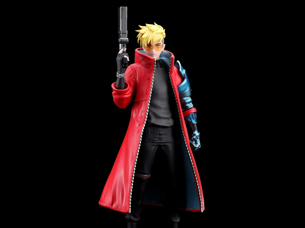 Desde el primer vistazo, la figura impacta con su presencia. Vash se presenta en una postura firme y elegante, con su característico abrigo rojo ondeando ligeramente y su pistola levantada en posición de combate. La figura captura perfectamente la mezcla de carisma, serenidad y poder que define al personaje: un pacifista de corazón atrapado en un mundo caótico, armado con una precisión letal.